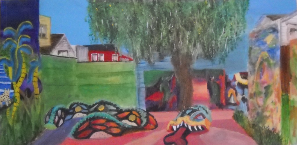 When I was living at my cousins in San Francisco I would often go out to Paint Plein air. Off 24th st in the mission district there was this awesome little park with Quetzalcoatl mosiac that really intrigued me so I decided i would try and paint it.