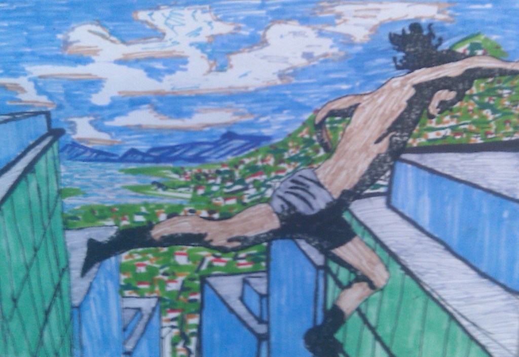 An Edited photo of my brother while he was cliff jumping in Yosemite that I turned into a stencil and then drew in a back round of San Diego