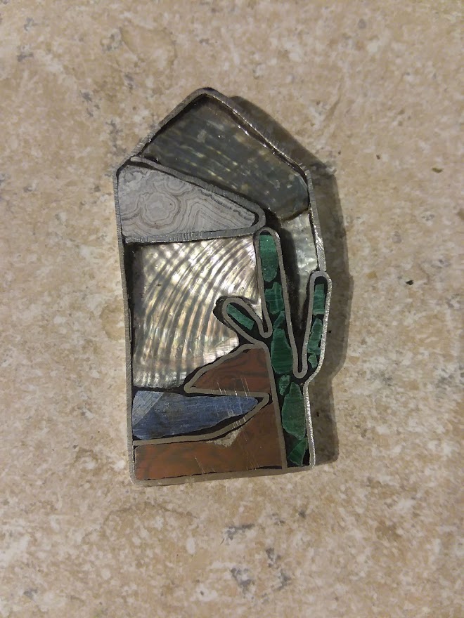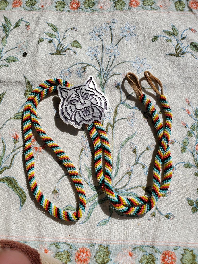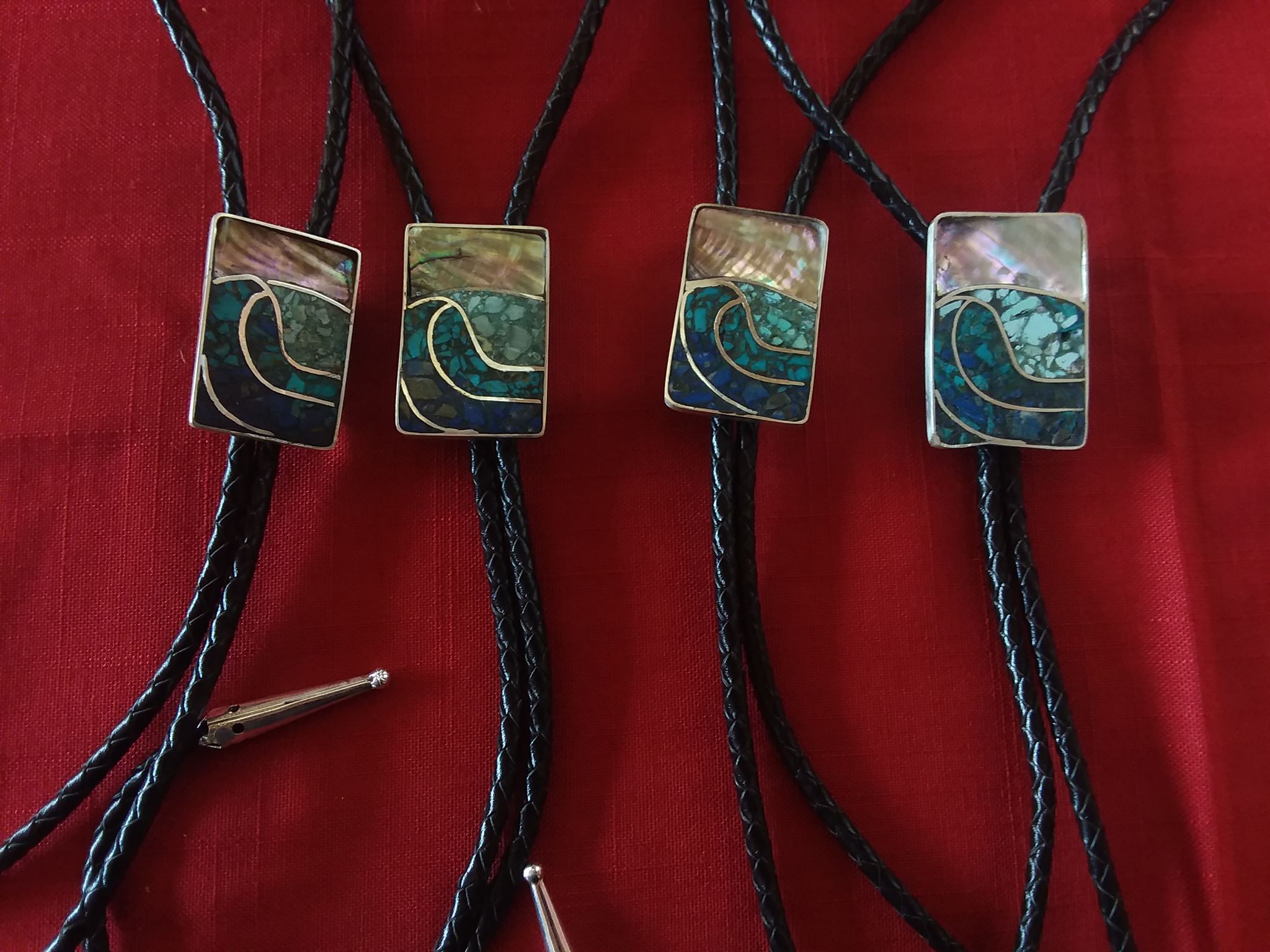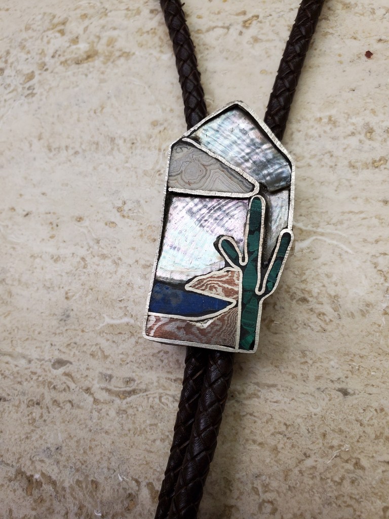 La Paz : Inlaid abalone, Mokumegane, Lapis Lazuli Desert Moonrise: Inlaid Abalone in picture jaspar.Wave brothers: Cast Turquoise and Abalone in silverDesert Climber: Mokumegane, silver and cast turquoise, mokumegane and malachiteDesert Saguaro: Cast Malachite inlaid in silver with picture jaspar pendant.“Replacement stolen bracelet”: Sterling SilverOllin Bolo Silver CATalyst Studios Earrings SilverWildcat Bolo for Associate dean CopperLa Paz Bolo Silver, Mokumegane, Malachite, Abalone, Chemehuevi Bolo for Vice PresidentWildcat Bolo: AluminumGila Bolo for Governor: Copper Mokumegane PendantPicuris Bolo for Governor: SilverRufus Bolo: SilverSACNAS Bolo: SilverWildcat Bolo for President: SilverWildcat Bolo: Silver and Beaded Cord